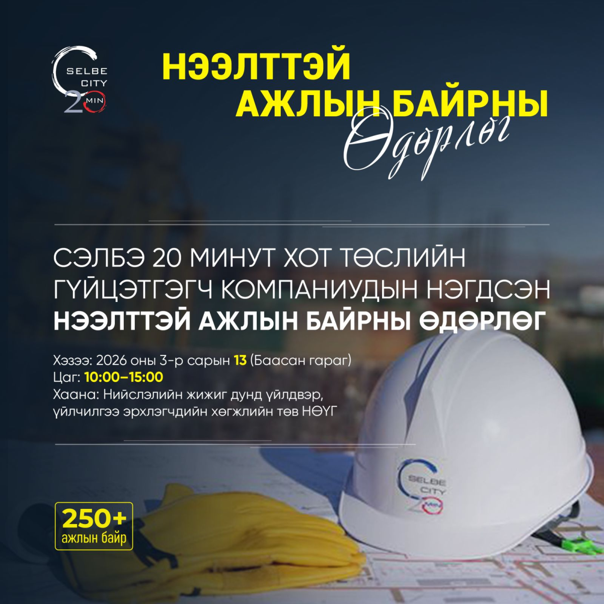 Нийслэлийн төвлөрлийг сааруулах, иргэдийн амьдрах таатай орчныг бүрдүүлэх зорилготой “Сэлбэ дэд төв орон сууцжуулах төсөл”-ийн бүтээн байгуулалтын ажил үргэлжилж байна. Төслийн ерөнхий болон туслан гүйцэтгэгч компаниуд нэгдэж, бүтээн байгуулалтад оролцож, барилгын салбарт ажиллах хүсэлтэй иргэдийг тогтвортой ажлын байраар хангах “Ажилд урьж байна” нээлттэй өдөрлөгийг 2026 оны гуравдугаар сарын 13-ны өдөр зохион байгуулахаар боллоо.