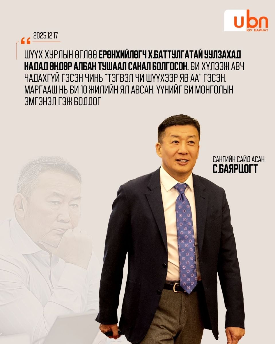 Тэрбээр "Хуулийн байгууллагуудыг хууль биш улс төр чиглүүлээд байна. Хамгийн том айдас нь энэ. ҮХЦ Үндсэн хуулийн дагуу шийдвэрээ гаргаж чадаж байна уу, үгүй юу гэдэг эргэлзээ төрүүллээ. Энэ бүгдээс харахад, манай улс төр арай л дэндэж байна. Хэмжээ хязгаараа давж байна. Албан тушаал түр зуурын.