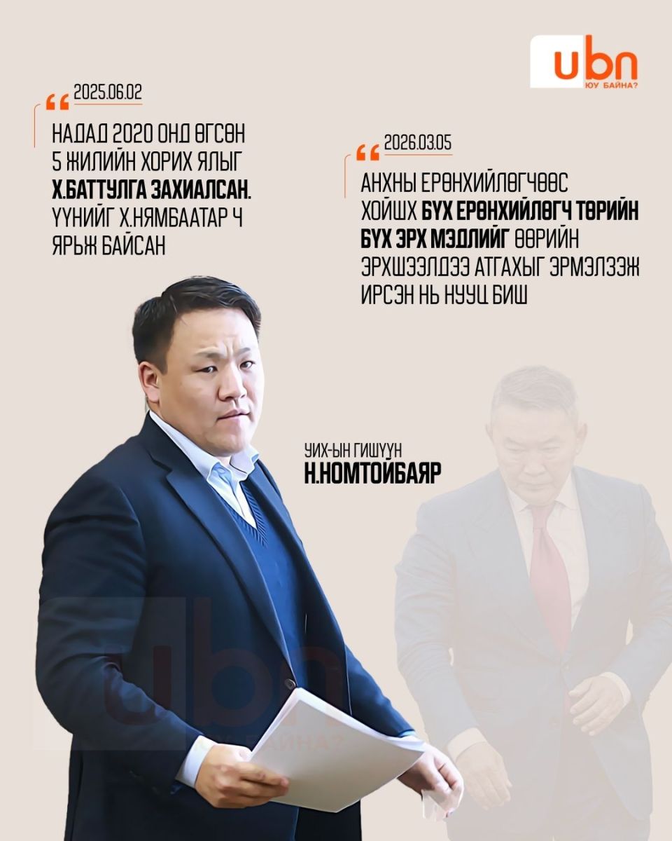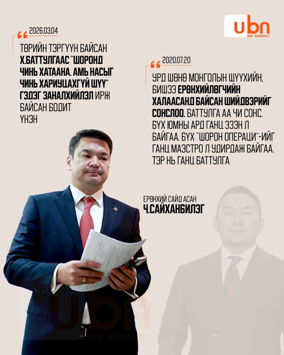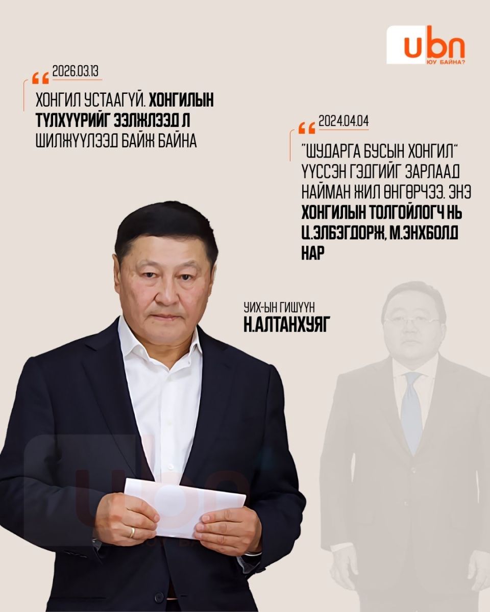 УИХ-ын гишүүн Н.Алтанхуяг. Түүнийг дөрвөн жилийн өмнөөс Хөгжлийн банкны хэрэгт холбогдуулан шалгаж эхэлсэн. Хамгийн сүүлд л гэхэд тэрбээр шүүхээс сонссон цагаатгасан шийдвэрээ хүчингүйд тооцуулаад буй. Тэгвэл тэрбээр өнгөрсөн хугацаанд өөрийгөө "хонгил"-оор чирэгдэж ирсэн нэгэн гэж мэдэгддэг. Энэ талаараа 2021 онд илэрхийлж байсан байр сууриндаа “Шударга бусын хонгил” үүссэн гэдгийг зарлаад найман жил өнгөрчээ. Өнөөдөр хонгил нураагүй байна. Энэ хонгилын толгойлогч нь Ц.Элбэгдорж, М.Энхболд нар. Шударга бусын хонгил гэдэг нь шударга иргэд, ААН эрхлэгчид, улстөрчдөд хэрэг үүсгэж хашраадаг, залхаадаг, улмаар хүссэнээрээ шийддэг бүлэглэлийнхний хэрэгсэл юм" гэж тодорхойлж байв.