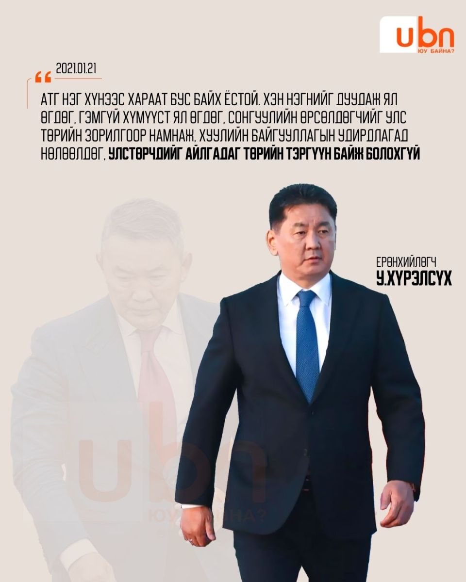 2021 оны нэгдүгээр сарын 21. Энэ өдөр У.Хүрэлсүх Ерөнхий сайдын үүрэгт ажлаасаа чөлөөлөгдсөн. Энэ үеэрээ чуулганы индэр дээрээс Үндэсний Аюулгүй байдлын зөвлөлийн дарга буюу Төрийн тэргүүнд хаягласан үгээ илэрхийлж байв. Тэрбээр "ТГ нэг хүнээс хараат бус байх, хэн нэгэн дуудаж ял өгдөг, гэмгүй хүмүүст ял өгдөг, сонгуулийн өрсөлдөгчийг улс төрийн зорилгоор намнаж, хуулийн байгууллагын удирдлагад нөлөөлдөг, улстөрчдийг айлгадаг төрийн тэргүүн байж болохгүй" гэсэн юм.