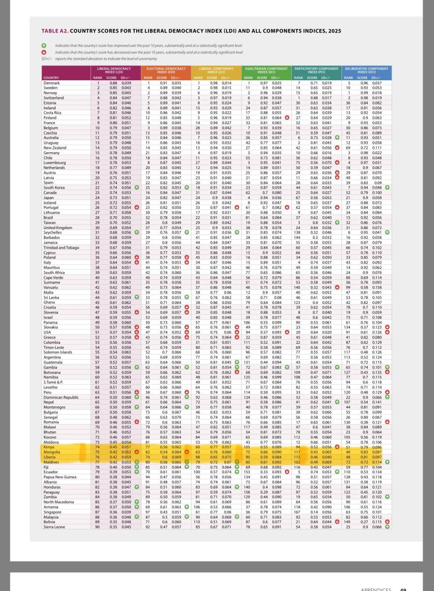 Дэлхийн улс орнуудын ардчиллын түвшинг нарийвчлан хэмжиж, ардчиллын индекс гаргадаг V-Dem буюу Varieties of Democracy төслөөс 2026 оны ардчиллын индексийн үзүүлэлтийг танилцуулаад байна. Эл индексийн либерал ардчилал хэсгээр манай улс 75 дугаар байрт жагслаа. Ийнхүү өгөрсөн жил 81 дүгээр байрт эрэмбэлэгдэж байсан манай улсын хувьд энэ жилийн үзүүлэлтээрээ зургаан байр урагшиллаа.