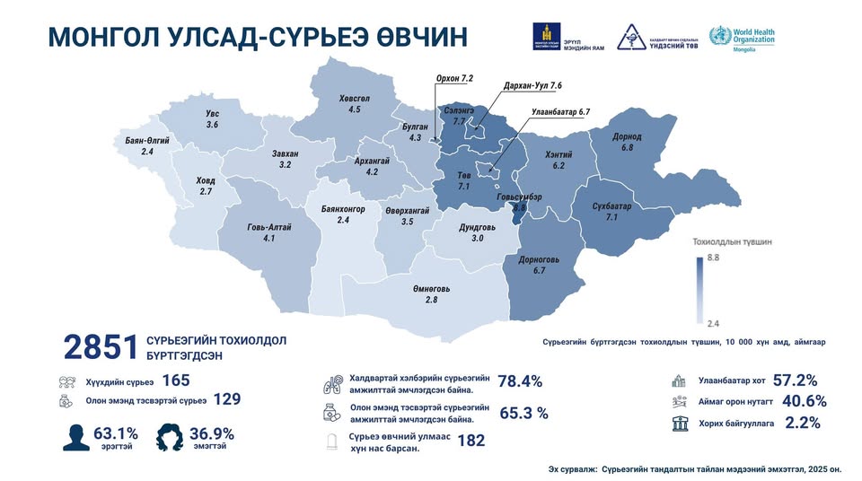 2025 оны мэдээгээр Монгол Улсад нийт 2851 сүрьеэгийн тохиолдол бүртгэгдэж, 182 хүн сүрьеэгийн улмаас нас барсан. Батлагдсан нийт тохиолдлын 165 нь хүүхдийн сүрьеэ, 129 нь олон эмэнд тэсвэртэй сүрьеэгийн тохиолдол байна.