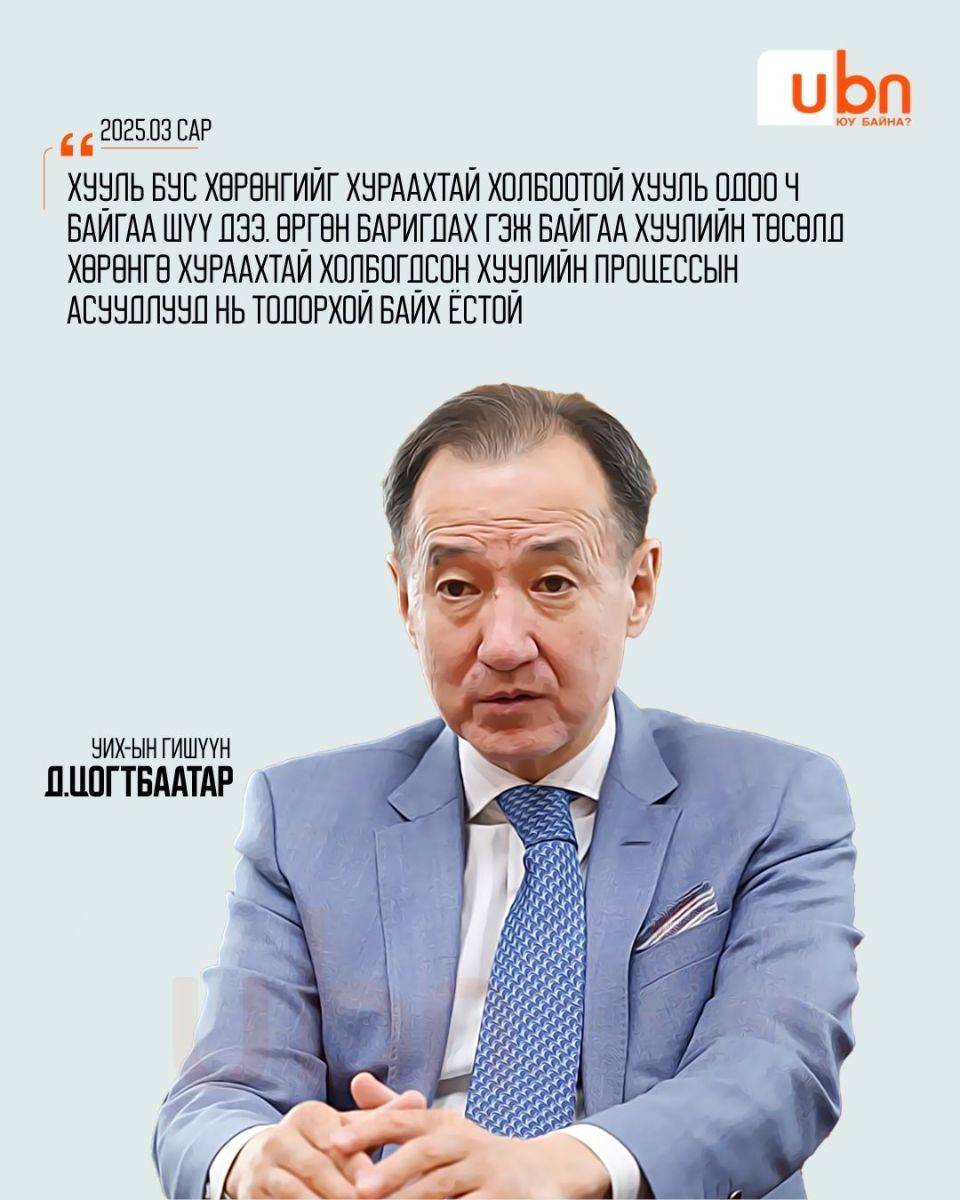 УИХ-ын гишүүн Д.Цогтбаатар: Хууль бус хөрөнгийг хураахтай холбоотой хууль одоо ч байгаа шүү дээ. Өнөөдөр хууль бус хөрөнгийг хурааж байгаа. Жишээлбэл, нүүрсний хулгайн асуудал дээр шүүхээс хөрөнгийг нь хураасан шийдвэр гарсан байдаг. Энэ хууль нь байсаар атал шинээр өргөн барих гэж байгаа хууль гэдэг шууд утгаар нь хүмүүс цочирдож хүлээж аваад байх шиг байгаа юм. Харин өргөн баригдах гэж байгаа хуулийн төсөлд хөрөнгө хураахтай холбогдсон хуулийн процессын асуудлууд нь тодорхой байх ёстой. Энэ тохиолдолд төсөлтэй танилцаж байж л саналаа хэлнэ. Одоохондоо мөн л хэвлэлийн мэдээлэлтэй байна.