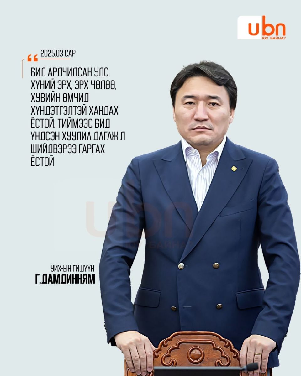 УИХ-ын гишүүн Г.Дамдинням: Одоо байгаа хуулийг шинэ хууль болгосон байдлаар ярьж байгаа бол аль алийг нь харьцуулж үзэх ёстой. Нэн түрүүнд хуулийн төсөл УИХ-д өргөн мэдүүлээд, гишүүдэд танилцуулагдах байх. Хоёрдугаарт, бид ардчилсан улс. Хүний эрх, эрх чөлөө, хувийн өмчид хүндэтгэлтэй хандах ёстой. Тиймээс Үндсэн хуулиа дагаж л бид шийдвэрээ гаргах ёстой.