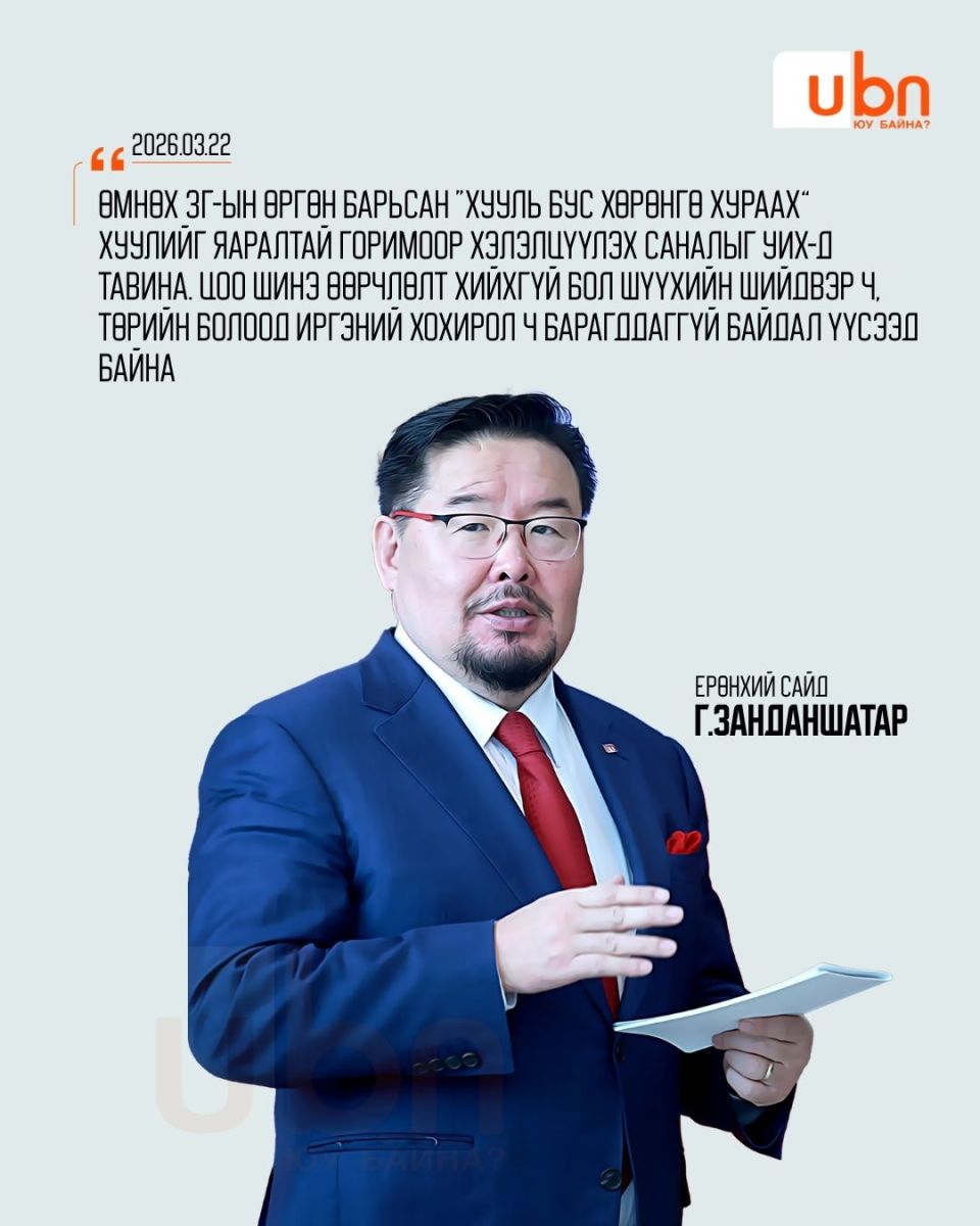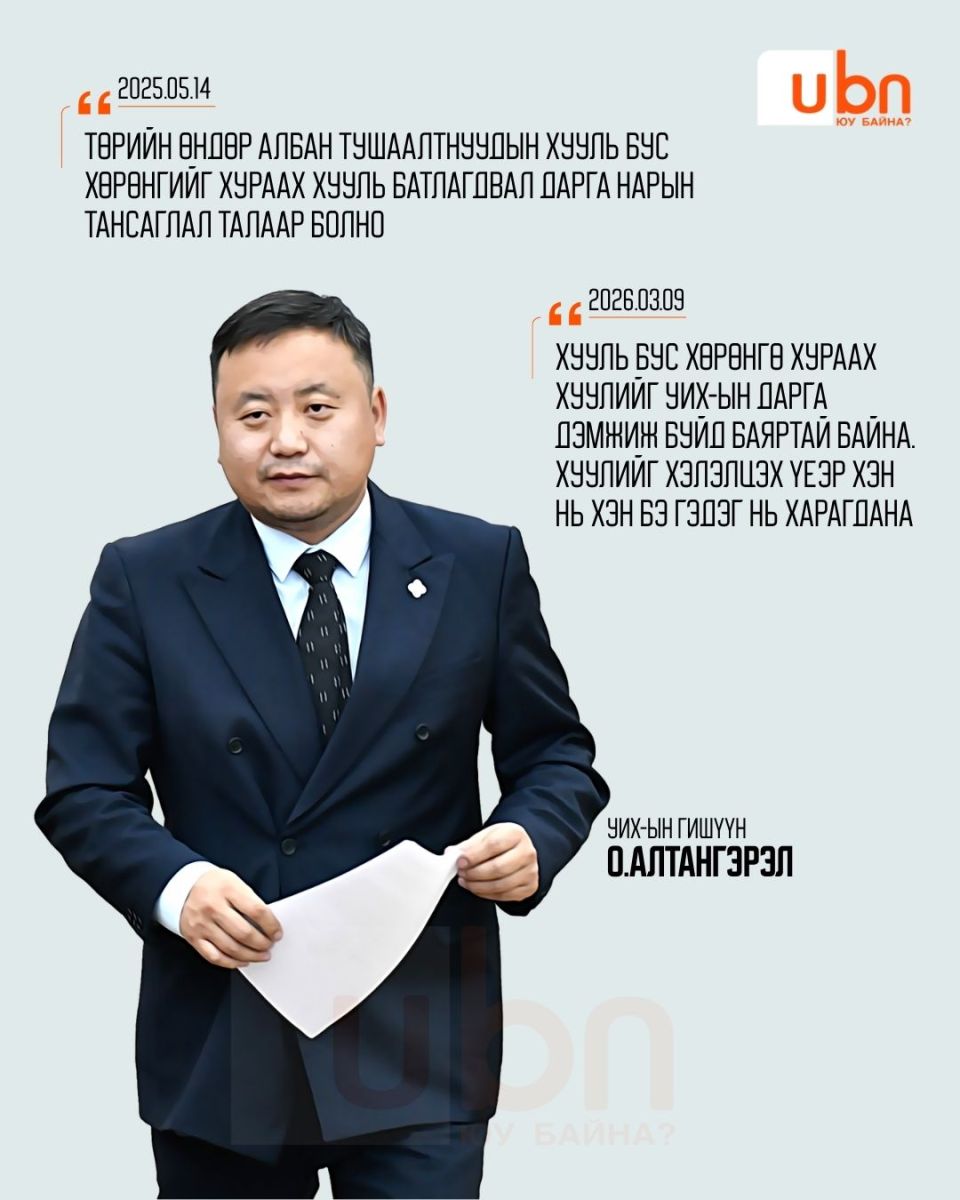 Өнгөрөгч оны гуравдугаар сард буюу Хууль зүй, дотоод хэргийн сайд асан О.Алтангэрэлийн автор бүхий "Нийтийн албан тушаалтны хууль бус хөрөнгийг хураан авах, нөхөн төлүүлэх тухай" хуулийн төслөө УИХ-д өргөн барихад бэлэн болсон талаараа мэдээлсний дараахан манай сайт УИХ-ын гишүүдээс байр суурийг нь тодруулж байв.