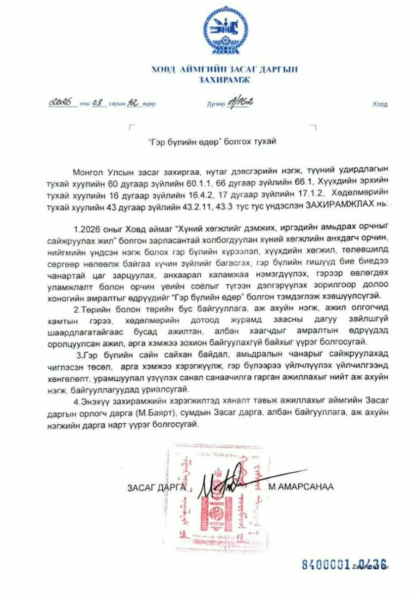 Ховд аймаг 2026 оныг "Хүний хөгжлийг дэмжих, иргэдийн амьдрах орчныг сайжруулах жил" болгон зарласан. Уг шийдвэртэй холбогдуулан нийгмийн үндсэн нэгж болох гэр бүлийн хүрээлэл, хүүхдийн хөгжил, төлөвшилд сөргөөр нөлөөлж байгаа хүнчийн зүйлийг багасгах, гэр бүлийн гишүүд бие биедээ чанартай цаг зарцуулах, анхаарал халамжийг нэмэгдүүлэх, гэрээр өвлөгдөх уламжлалт болон орчин үеийн соёлыг түгээн дэлгэрүүлэх зорилгоор долоо хоногийн амралтын өдрүүдийг "Гэр бүлийн өдөр" болгон тэмдэглэх захирамжийг Аймгийн Засаг дарга гаргасан байна.