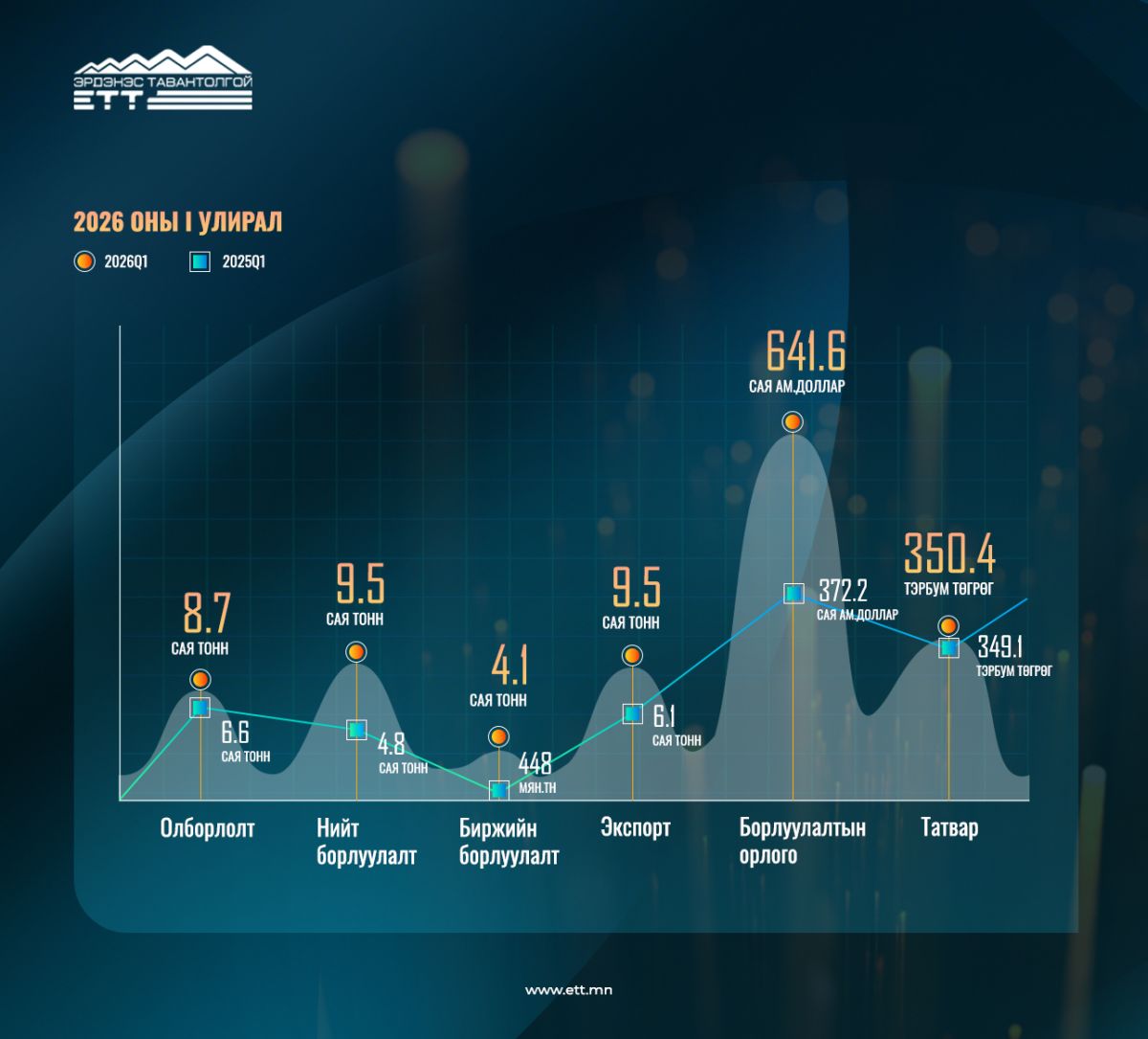 Өнгөрсөн 2025 оны нэгдүгээр улиралд 4.8 сая тонн нүүрс борлуулж байсан бол энэ оны нэгдүгээр улиралд 9.5 сая тонн нүүрс борлуулж 101 хувь өсөлттэй гарлаа. Экспорт өнгөрсөн оны нэгдүгээр улиралд 6.1 сая тонн байсан бол энэ оны 1 дүгээр улиралд 9.5 сая тоннд хүрч 56 хувь өслөө.