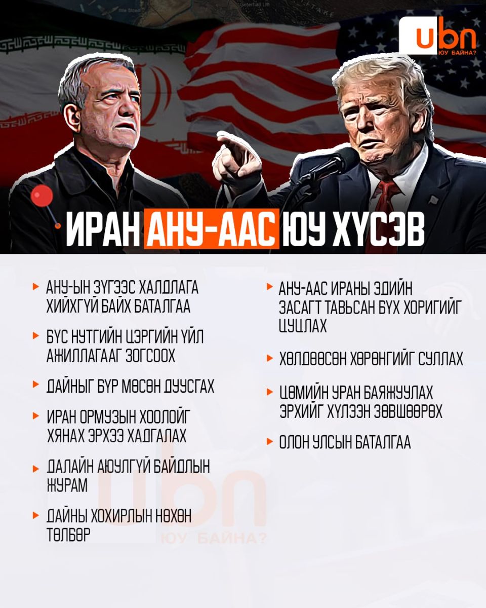 Харин талууд анх удаа харилцан гал зогсоох тохиролцоонд хүрсэн. Хоёр долоо хоногийн хугацаанд гал зогсоох ба энэ хугацаанд албан ёсны хэлэлцээр хийх тохироонд хүрэх учиртай. Иран Ормузын хоолойг хянаж байгаа ч бүс нутагтаа цохилтууд авсан нь буулт хийхэд нөлөөлсөн байх. АНУ болон Израйл Ираны цахилгаан станц болон дэд бүтцийн байгууламжуудад цохилт өгсөн. Энэ бүхэн асуудлыг хүндрүүлсэн нь ойлгомжтой. Тэр ч утгаараа хэлэлцээрийн ширээний ард суух сонирхол Иранд илүү гарч ирлээ. Ираны зүгээс 10 саналыг АНУ-ын талд хүргүүлсэн. Ираны талаас илүү урт удаан хугацааны энх тайван болон эдийн засгийг сайжруулахад чиглэсэн саналуудыг илгээсэн байна. Харин АНУ-ын Ерөнхийлөгч Д.Трамп дээрх 10 саналыг яриа хэлэлцээ эхлүүлэх боломжтой асуудлууд гэж харж буйгаа хэлээд амжсан. Эдгээр 10 заалтад санал зөрөлдөх болон хүлээн зөвшөөрөх заалтууд байгаа. Хэрхэн шийдэгдэх эсэх нь гал зогоосон уг өдрүүдэд шийдэгдэх учиртай. Нөхцөл байдлыг АНУ өөрсдөдөө ашигтайгаар эргүүлэх боломж илүү байгаа. Тэр ч утгаараа энэ удаад Иран өөрсдийн хүслийн жагсаалтаа АНУ-д илгээж байна.