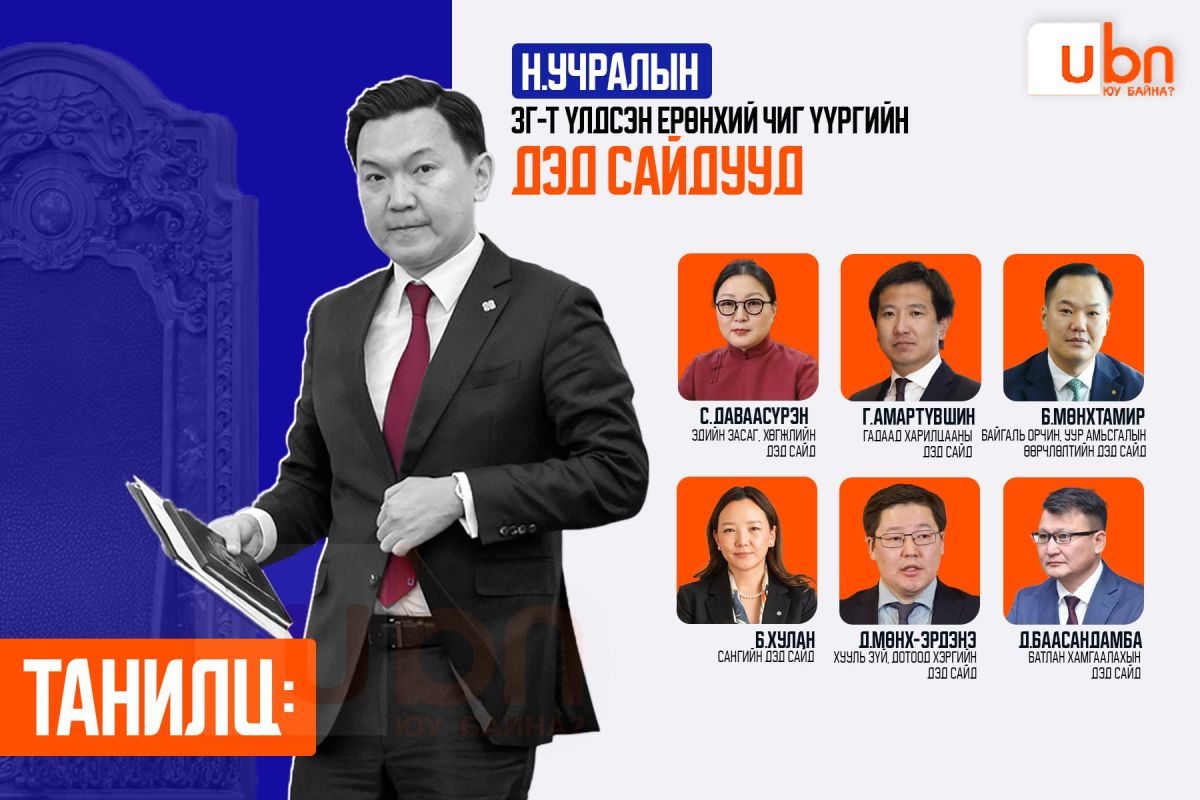 Юун түрүүнд Н.Учралын Засгийн газарт улиран ажиллаж буй зургаан дэд сайдтай танилцъя. Тэднийг ерөнхий чиг үүргийн сайдууд тул үлдээсэн нь энэ юм.