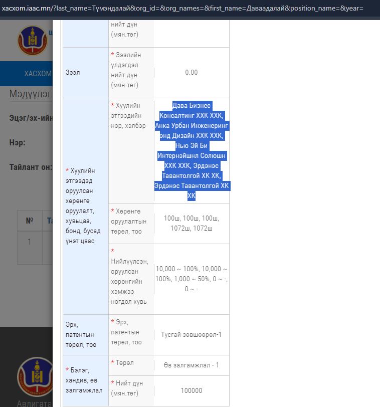 Үүнээс гадна Хотын нэгдүгээр орлогч Т.Даваадалай нь ХОМ-ээ “Дава Бизнес Консалтинг”, “Нью Эй Би Интернэйшнл Солюшн”, “Эрдэнэс Тавантолгой” зэрэг компанид хувьцаа эзэмшдэг хэмээн мэдүүлжээ.