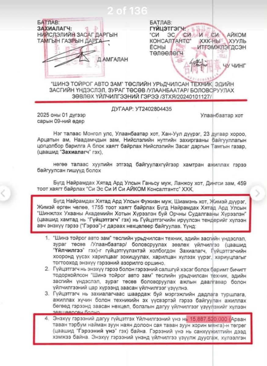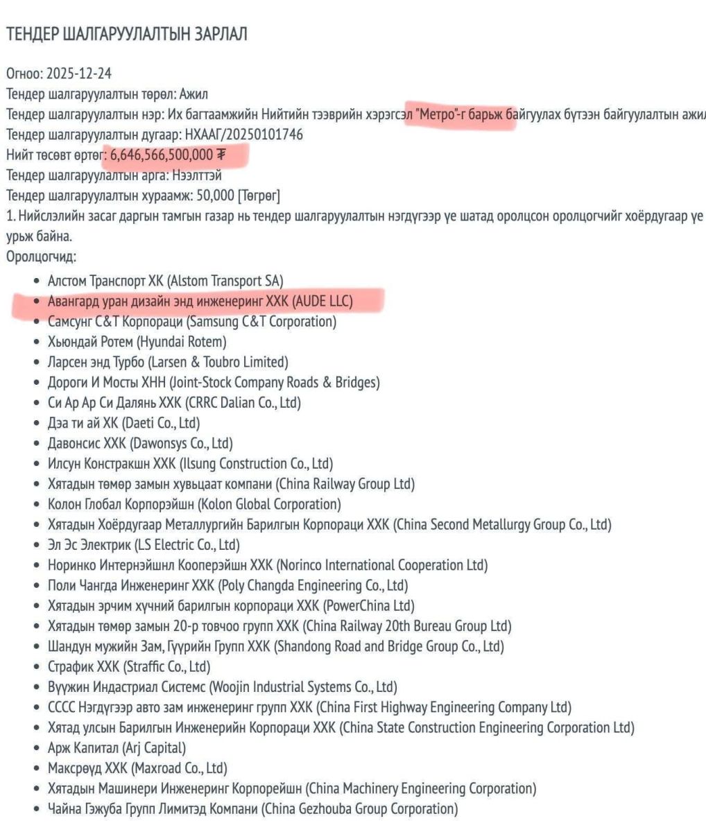 Мөн эхнэрийнх нь нэр шилжүүлсэн гэх “Авангард Уран Дизайн энд Инженеринг” ХХК нь Метро төслийн тендерийн II шатанд шалгарсан дотоодын гурван компанийн нэг нь юм.