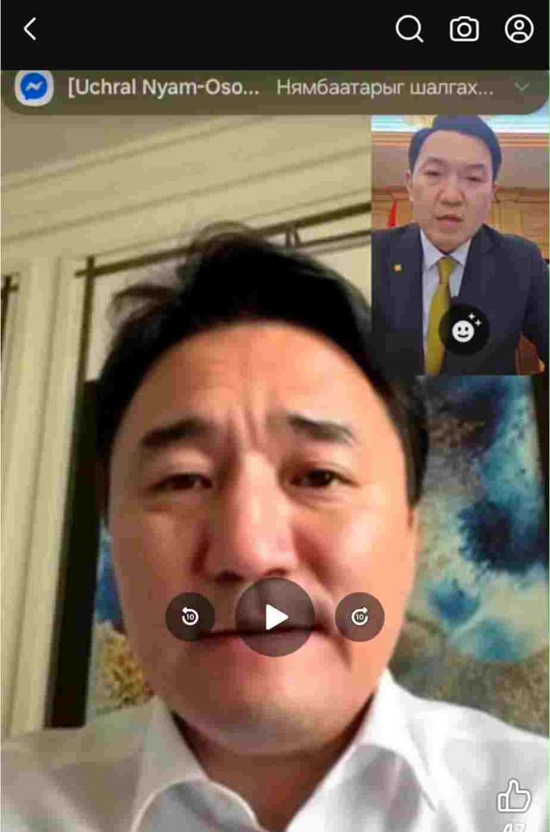 Ерөнхий сайд Н.Учрал өнөөдөр өглөө цахим хуудастаа Казахстан улсад айлчилж буй Ерөнхийлөгчийн айлчлалын багт яваа АҮЭБ-ийн сайд Г.Дамдиннямтай видео колл хийсэн. Тэрбээр энэ дүрст дуудлагаараа түлш, шатахууны үнийн талаар мэдээлэл авсан. Энэ үеэр түүний утасны дэлгэц дээр "Нямбаатарыг шалгах" гэсэн чат, мессеж ирж буй нь бичигдэн үлджээ. Энэ нь хэнээс ирсэн, ямар учиртай болох нь сошиал орчны ярианы сэдэв болоод байгаа юм.
