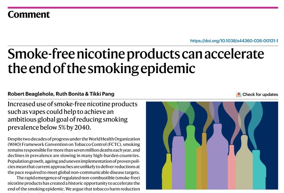 Олон улсын эрүүл мэндийн бодлогын салбарт олон жил ажилласан гурван нэр хүндтэй судлаач — Robert Beaglehole, Ruth Bonita, Tikki Pang — Nature Health сэтгүүлд нийтэлсэн өгүүлэлдээ дэлхийн тамхины хяналтын бодлогод “хор хөнөөлийг бууруулах” (harm reduction) зарчмыг албан ёсоор нэгтгэхийг уриалжээ. Эдгээр мэргэжилтнүүд нь дэлхийн тамхины эсрэг бодлогын суурийг тавилцсан хүмүүс бөгөөд өнөөгийн арга барил хангалтгүй байгааг онцолж буй нь онцгой ач холбогдолтой юм.