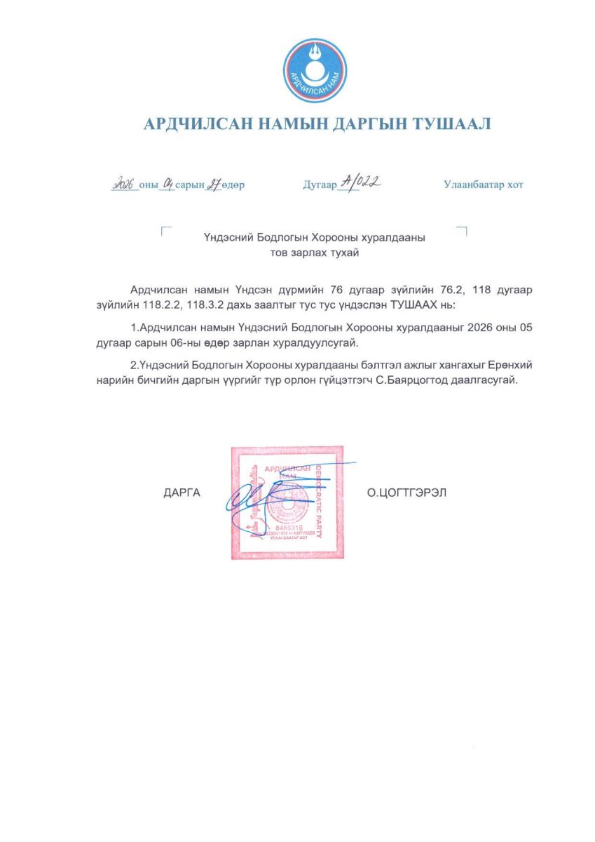 Ардчилсан намын Үндэсний бодлогын хорооны хурал ирэх 5-р сарын 6-ны лхагва гарагт Төрийн ордонд хуралдахаар болжээ. Одоогоор цаг товлоогүй байгаа аж. Тодруулбал, АН-ын Ерөнхий нарийн бичгийн даргын үүрэг гүйцэтгэгчээр сонгогдоод буй С.Баярцогтыг жинхлэх эсэхийг шийдвэрлэх юм.